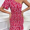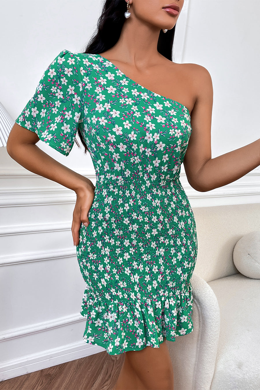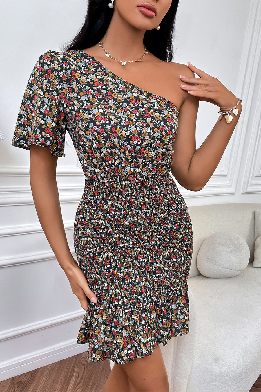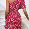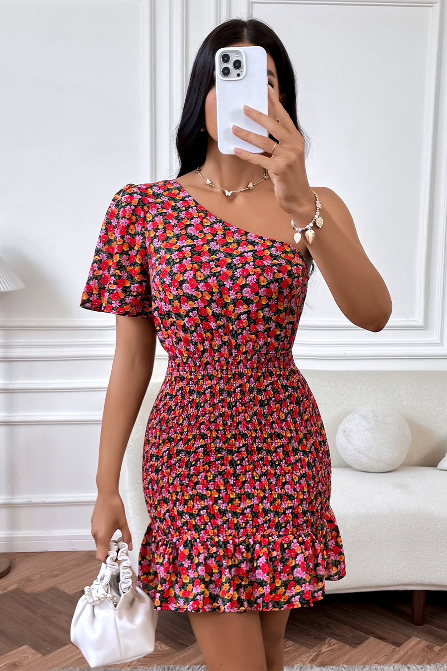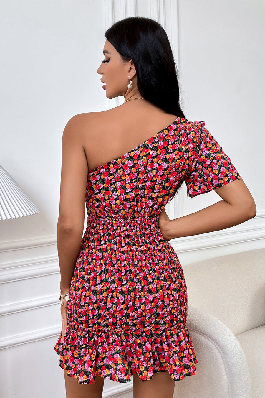 One Shoulder Floral Ruffle Sheath Short Cocktail Dress