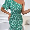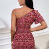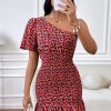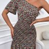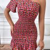 / One Shoulder Floral Ruffle Sheath Short Cocktail Dress